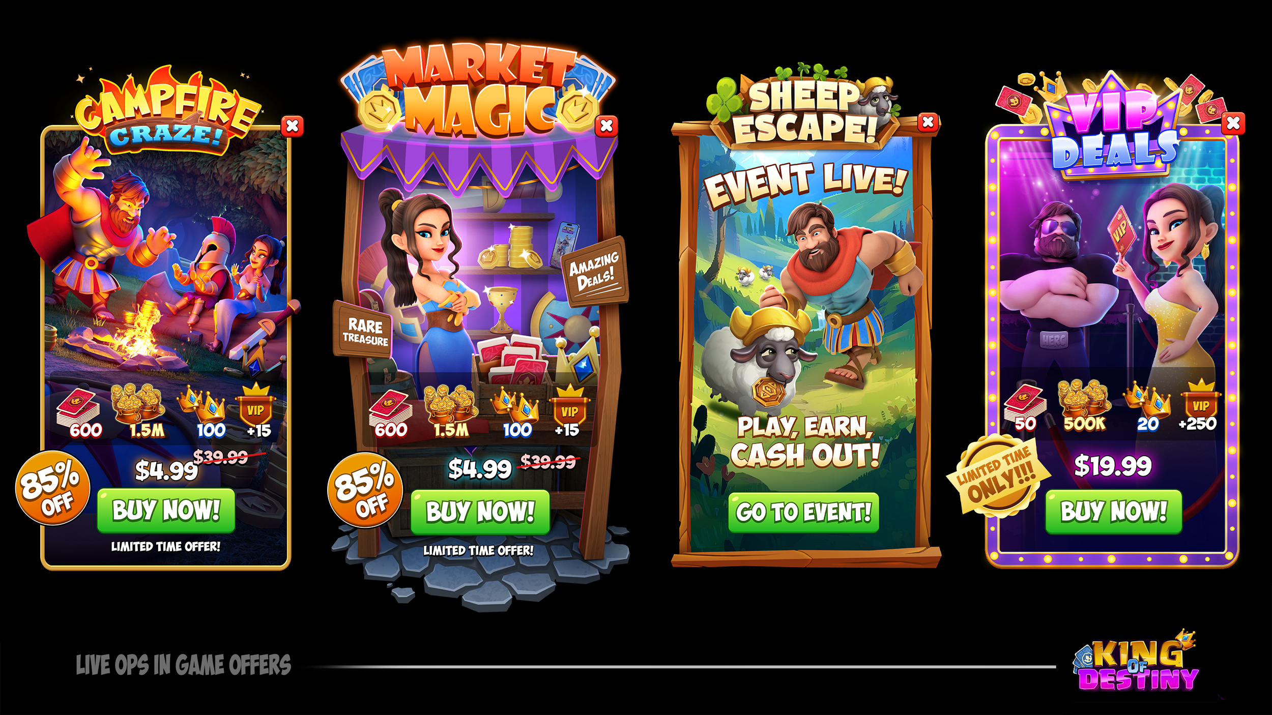 Below are some of my favorite offers that I created for King Of Destiny. These offers utilized a number of different techniques and workflows and were designed them to be used in both statics and also as motion graphics in marketing ads.