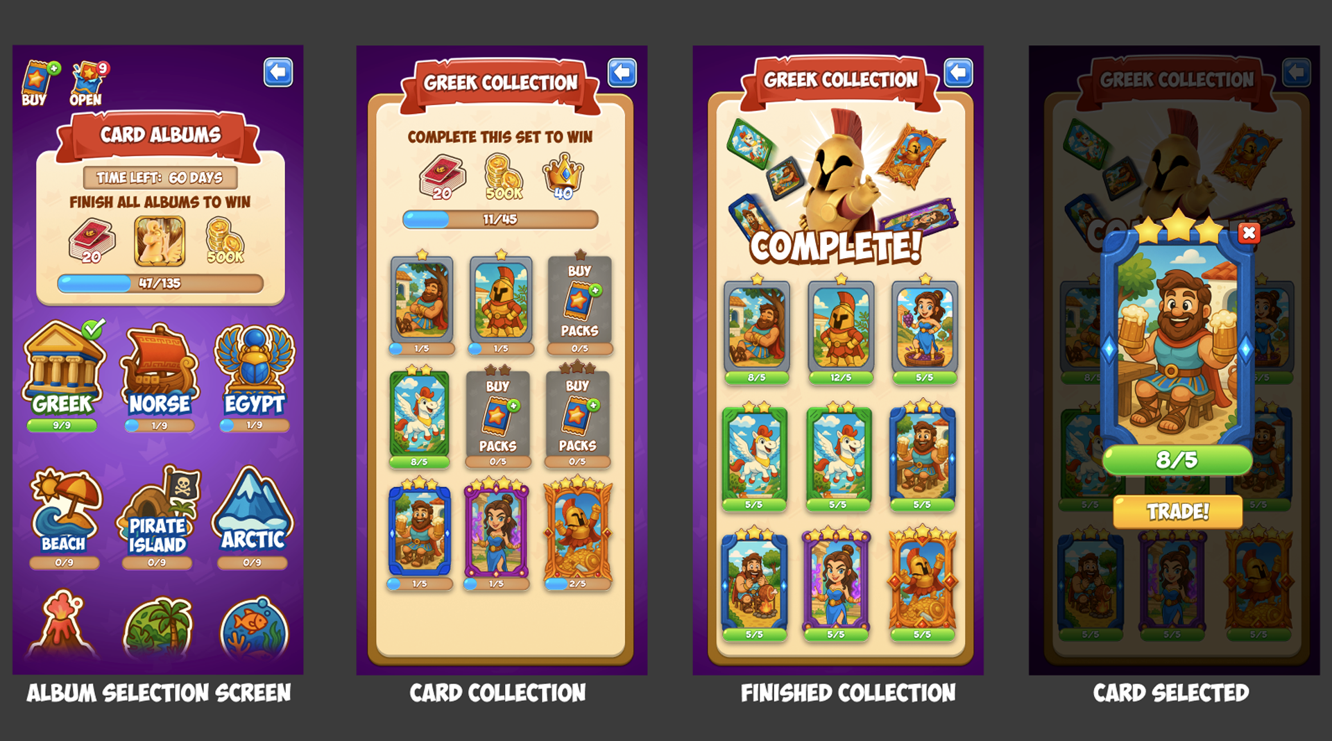 I led the KOD Card Album feature. The goal of this feature was to create collectables that players could acquire throughout their game. Finishing these albums gave the player mini wins and incentivized repeat play sessions.